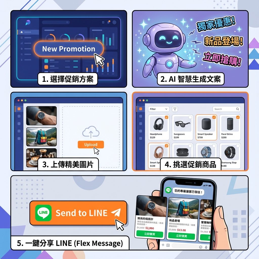 強調 AI 生成文案與 LINE 分享,讓行銷事半功倍。
